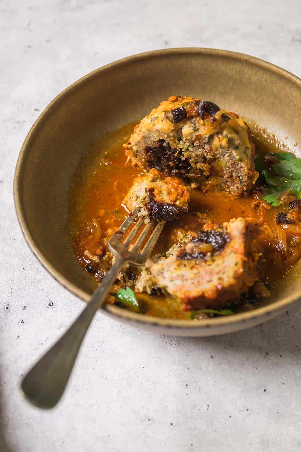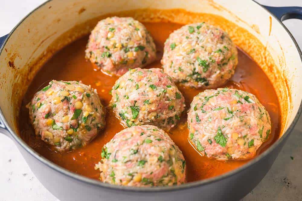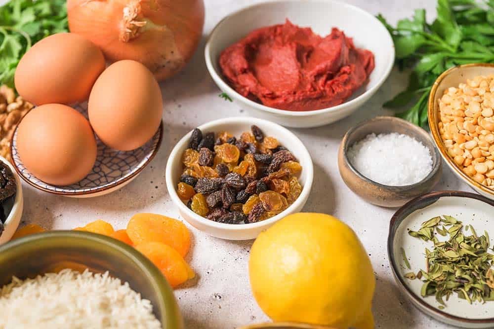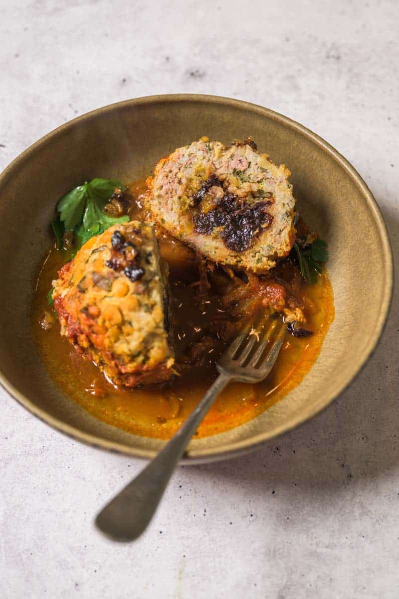 The mixture combines herbs, grains, and ground beef for structure and tenderness. The centers are filled with a mixture of dried fruit and walnuts for contrast and richness. Then everything gently braises in a tomato-spiced broth scented with lemon, mint, and warm spices until the flavors fully settle in.