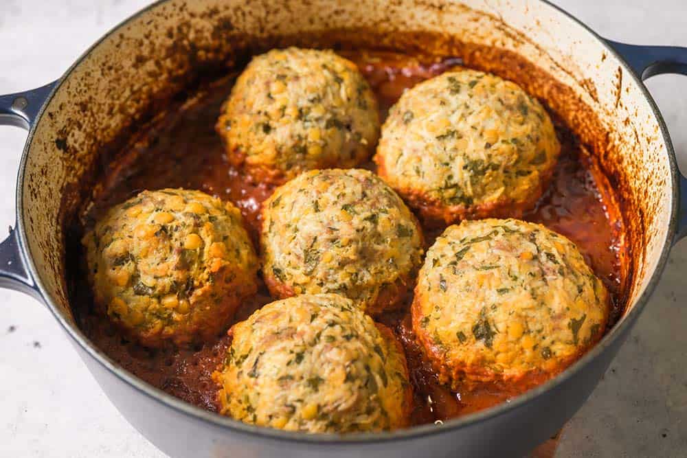 - Carefully set the formed meatballs into the prepared sauce, then cover and braise for 90 minutes.
