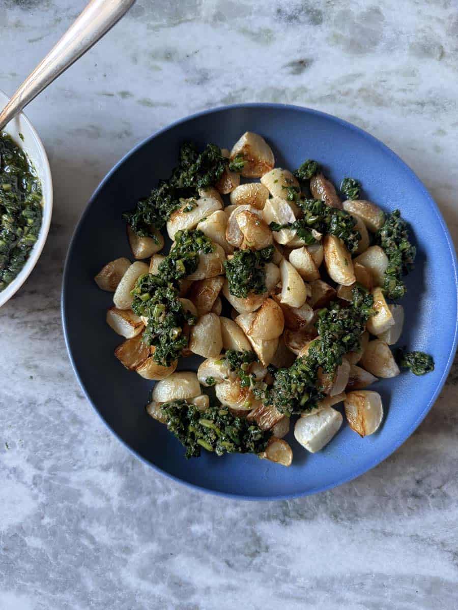 This recipe utilizes the whole vegetable, roots and greens, so make sure you pick up bunches with lovely, healthy-looking leaves. This dish also highlights California olive oil, using it for roasting and sizzling…so make sure you’ve got a good amount on hand!