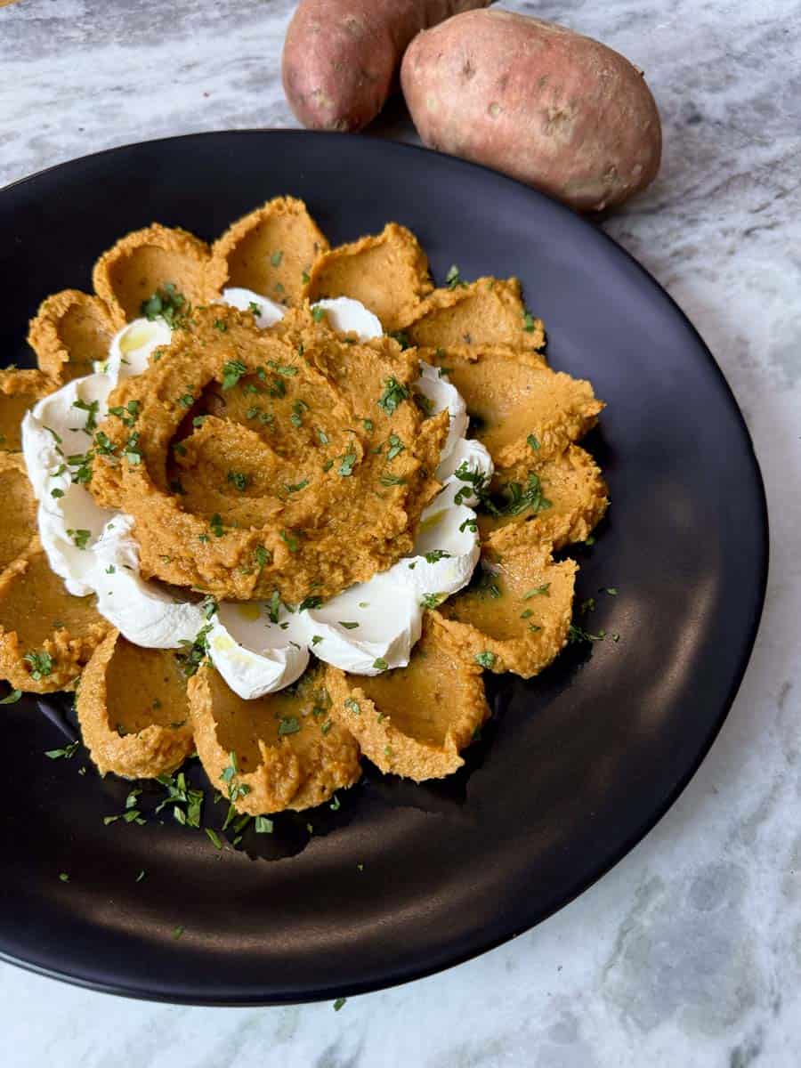 Everyone loves a great dip, and this recipe uses beautiful orange sweet potatoes and warm, bright spices to bring a wonderful sweetness to a classic hummus.
