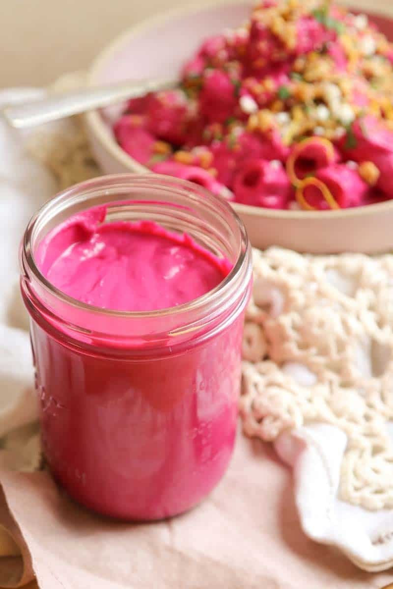 Once cooked and blended, beets become smooth and slightly sweet. That natural sweetness balances the tang of the yogurt and lemon, while also softening the cheese’s saltiness. The result is a sauce that feels cohesive and well-rounded rather than sharp or overpowering.