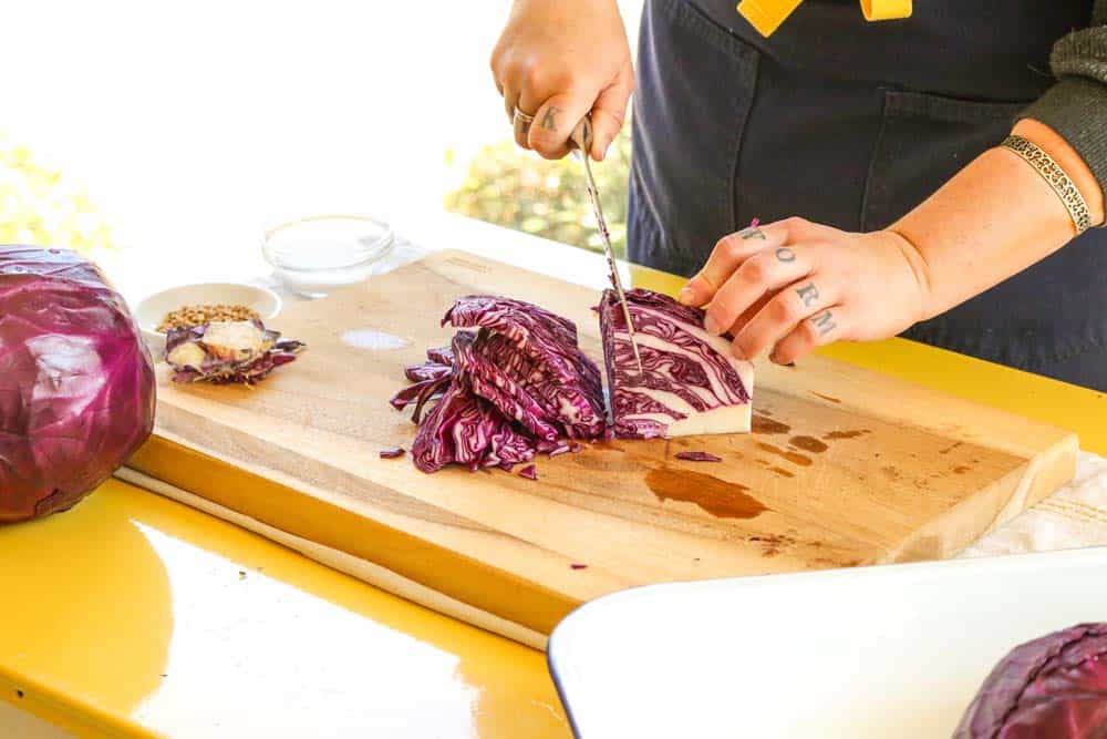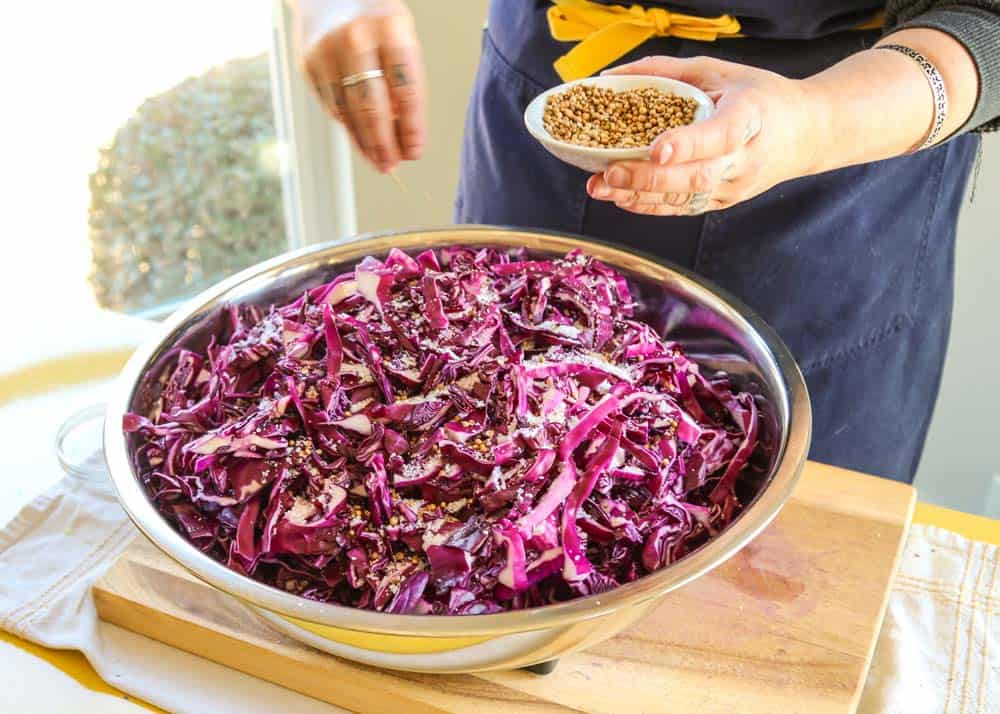 • Sprinkle the kosher salt and caraway seeds over the sliced cabbage.
