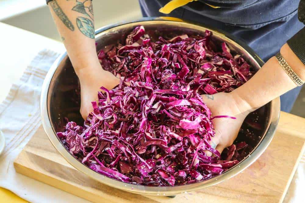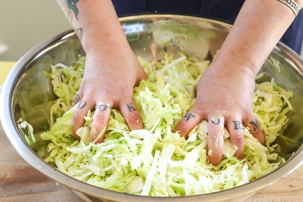 What makes this particular easy sauerkraut recipe satisfying is the three-stage scrunch. Christina walked me through it step by step, and once you do it yourself, it clicks. Here is how it goes: