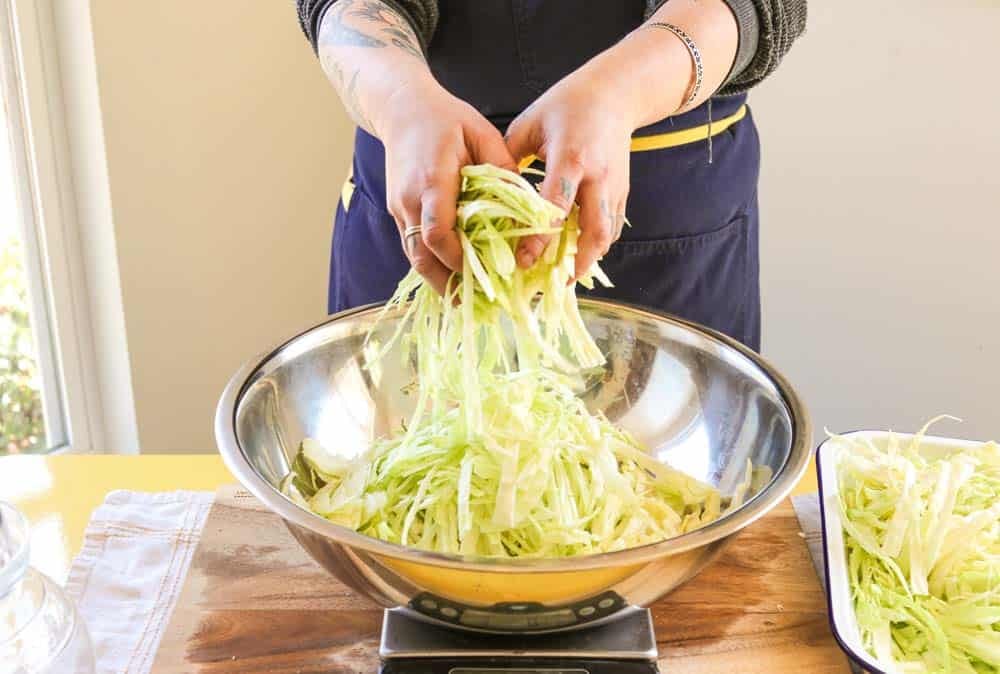The salt ratio is 3% of the cabbage weight — accuracy matters for safe fermentation.