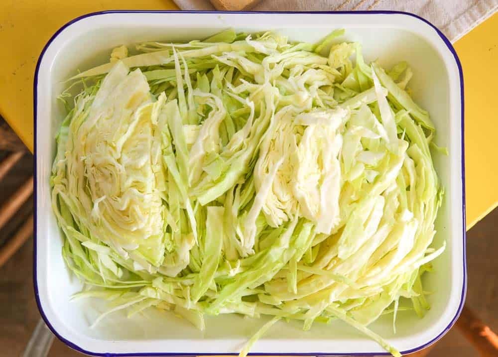 1. Thinly slice your cabbage and pile it into a very large mixing bowl. Sprinkle kosher salt and caraway seeds over the shredded cabbage.