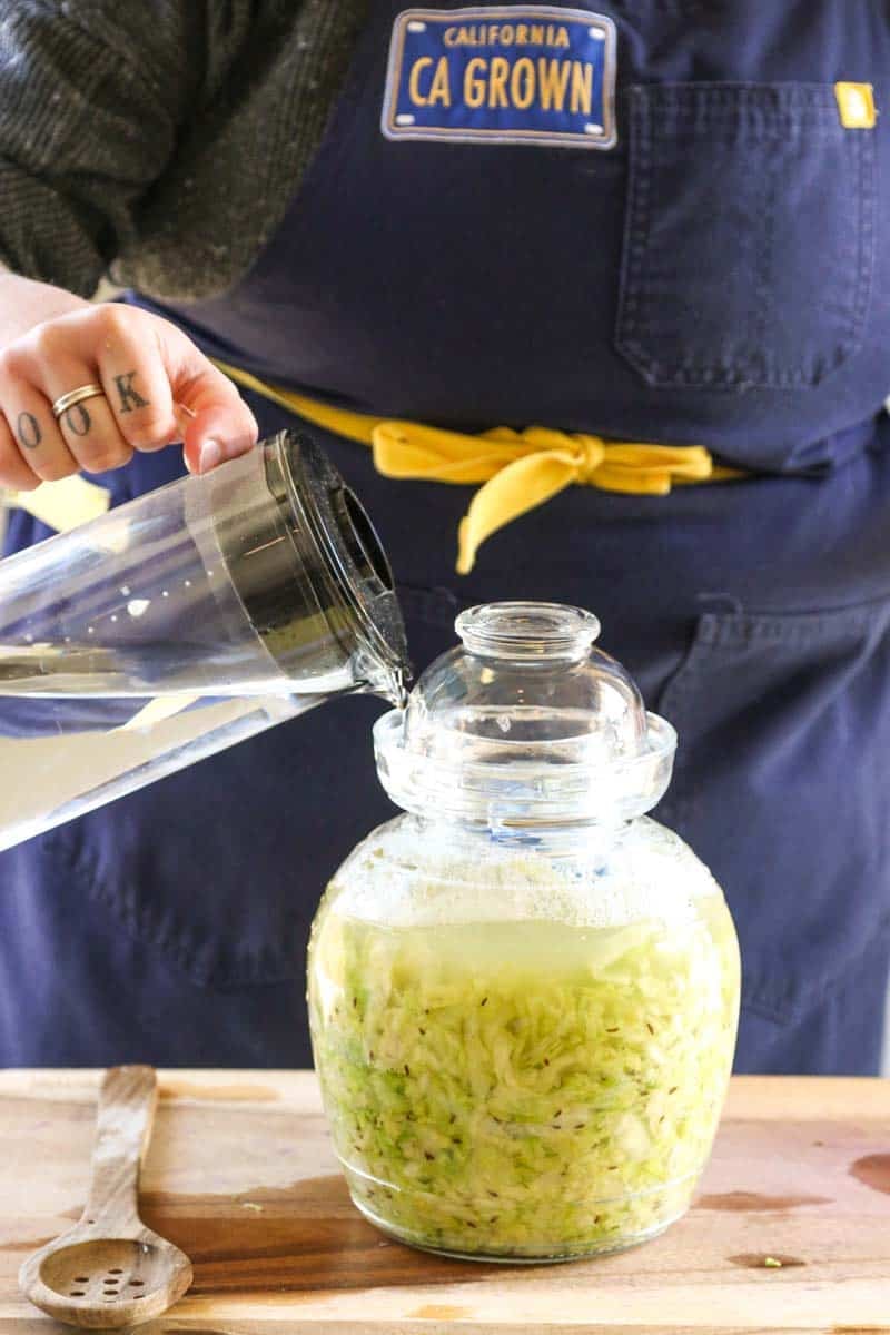 • Place a fermentation weight on top of the cabbage to keep it below the brine line at all times. See recipe notes for what to do if you do not have fermentaion weights.