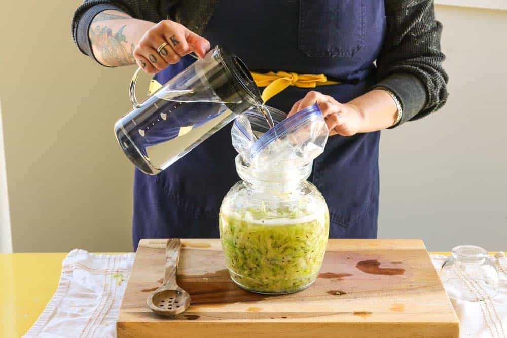 If you do not have a glass fermentation weight, a zip-lock freezer bag filled with brine works perfectly. Fill a clean bag about halfway with a saltwater solution made with 1 TBSP of kosher salt and 2 cups of water. We use brine rather than plain water so that if the bag ever leaks, you won’t dilute your ferment. Push out as much air as possible, seal it tight, and maybe double-bag it for extra security.