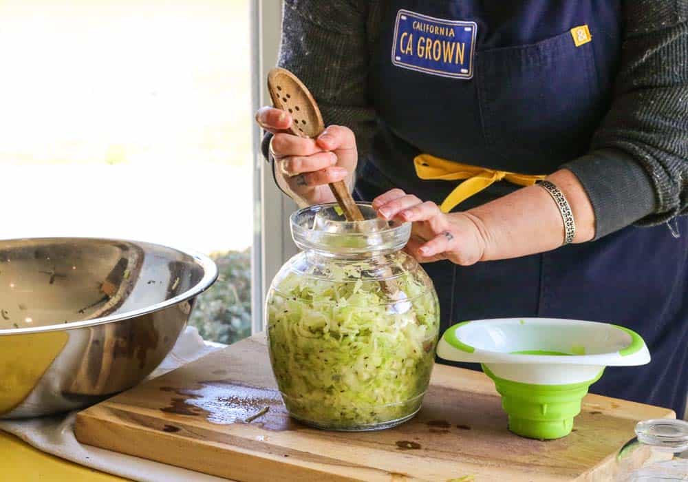 • Pack the cabbage tightly into clean fermentation jars, leaving 3/4-inch headroom.