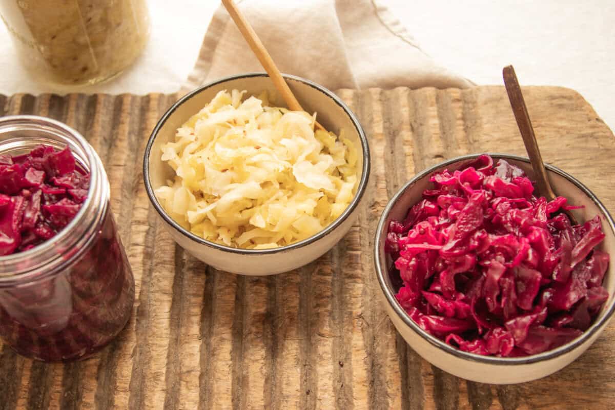 Jars and bowls of sauerkraut made with both red and green cabbage.
