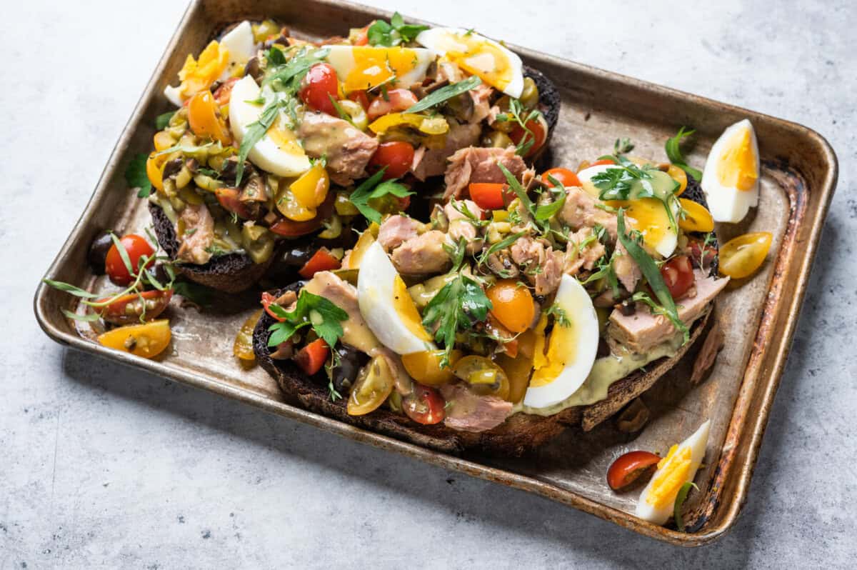 This Niçoise Toast layers chopped California ripe olives, cherry tomatoes, capers, tuna, and hard-boiled eggs over crisp sourdough, all brought together with a bright olive-brine vinaigrette and caper aioli. The result is a fresh, briny take on classic Niçoise flavors, designed for quick preparation and immediate serving. Click here to make.