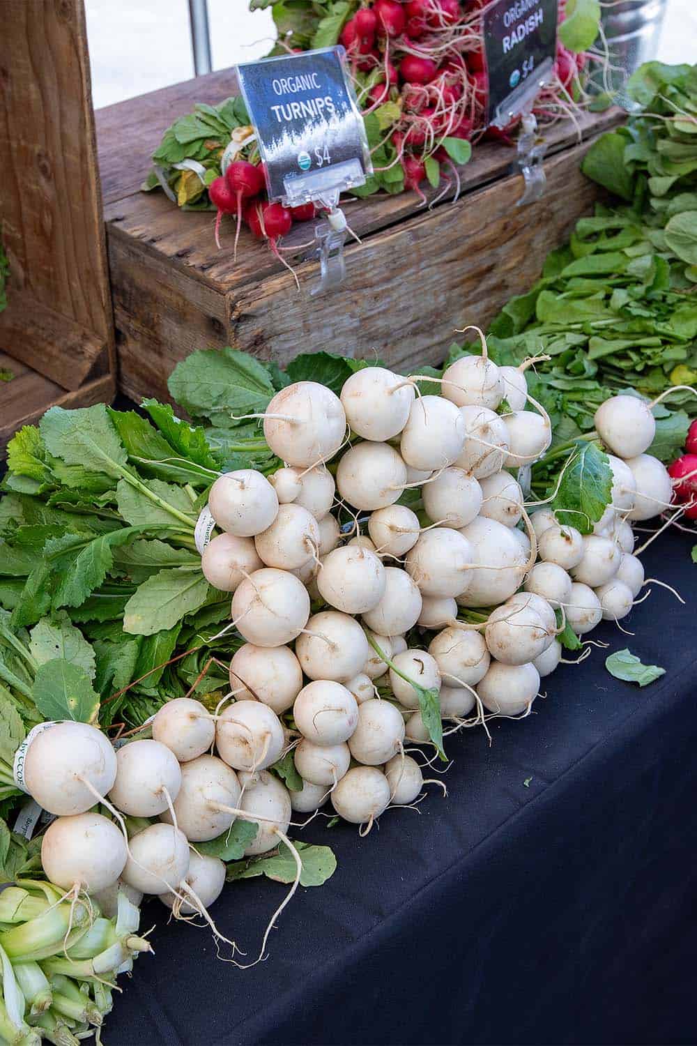 This is the kind of recipe that starts with a canvas tote bag and a stroll through your local California farmers’ market. Look for harukei turnips sold in bunches with vibrant, healthy greens still attached. If the leaves look perky and deeply green, you’re in business. Limp or yellowing greens are a pass — remember, they’re doing real work in this recipe.