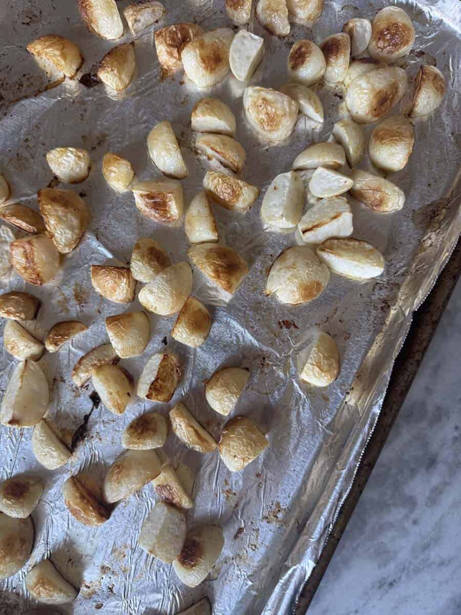 - Trim the greens from the turnips, and set them aside. Trim off any long roots on the turnips and give them a good scrub. Pat dry, then cut into quarters. Add the cut turnips to a bowl and toss with the 2 TBSP of California extra virgin olive oil and salt, then arrange evenly over the prepared baking sheet.